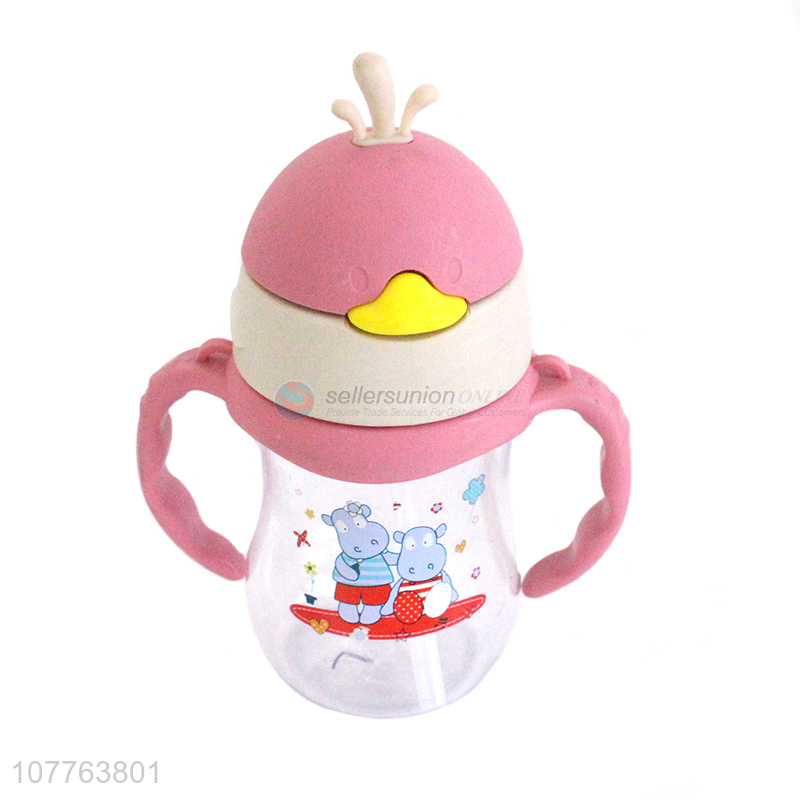 Low price cartoon penguin children water bottle with straw and handles